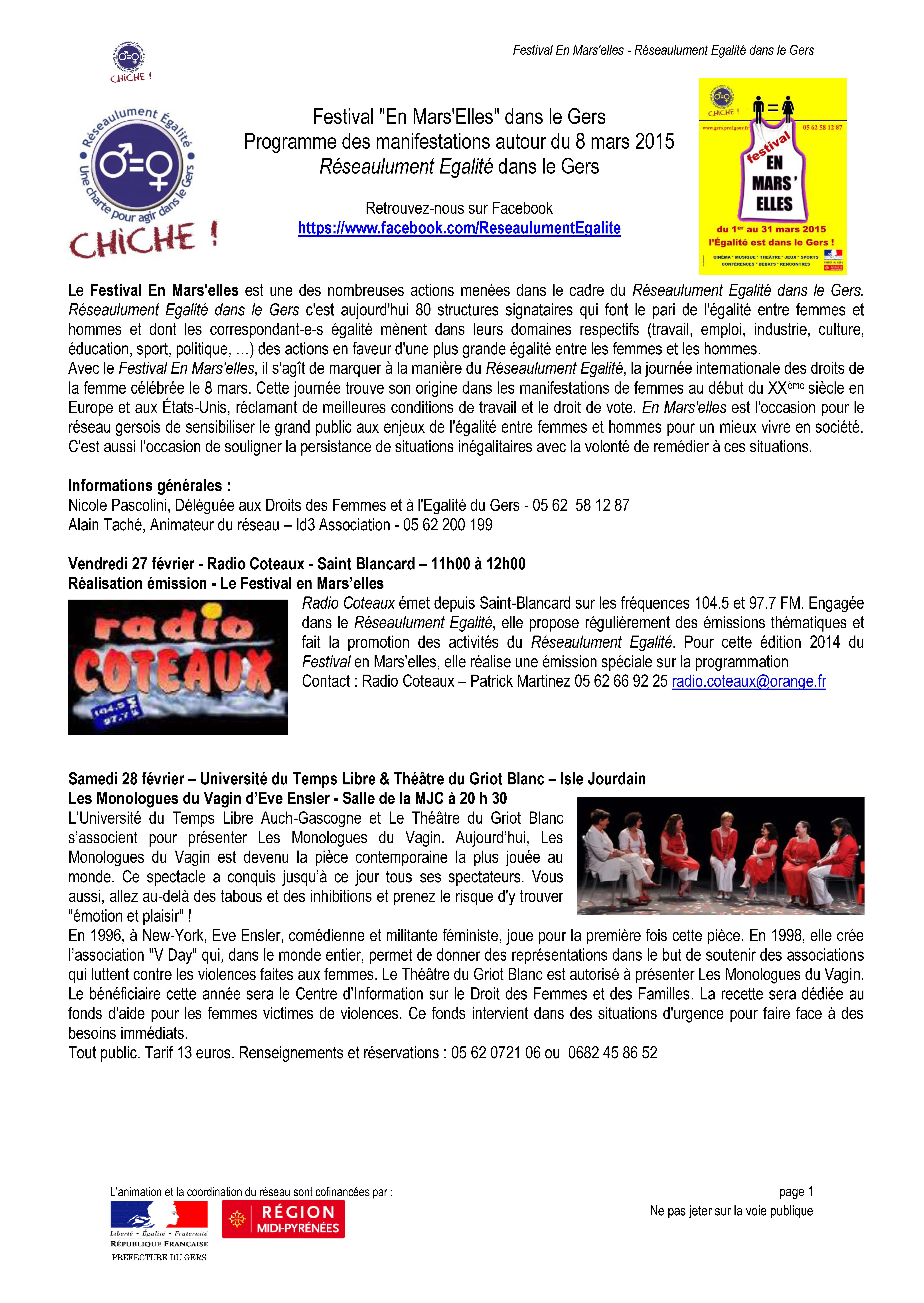Le programme des actions dans le cadre de En Mars’elles 2015. Des actions menées par le Réseaulument Egalité dans le Gers. Réseau à l’initiative de Nicole Pascolini, Déléguée aux Droits des femmes et à l’Egalité du Gers.